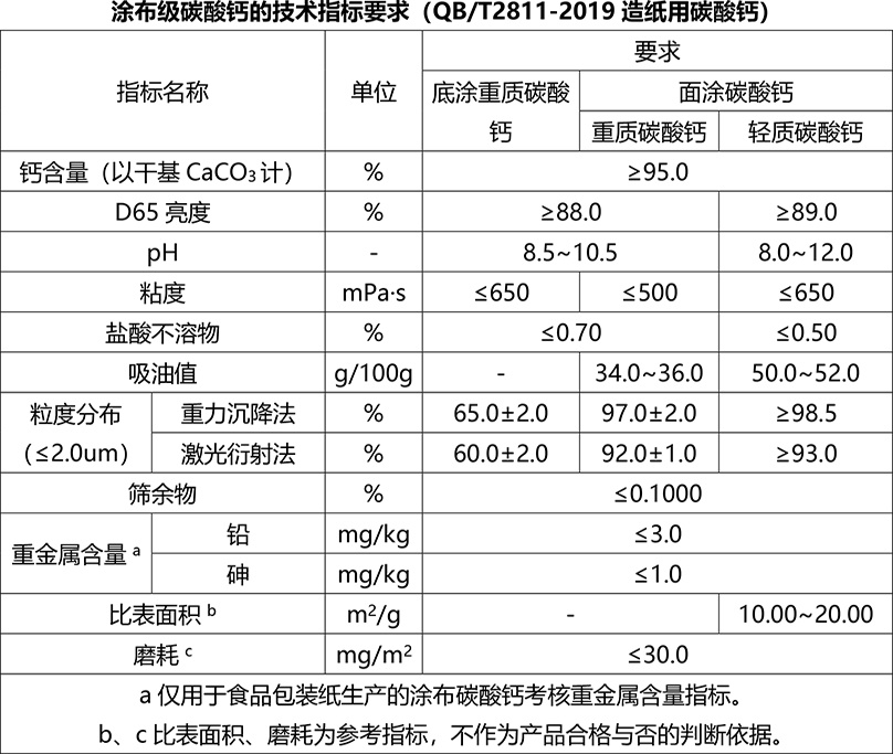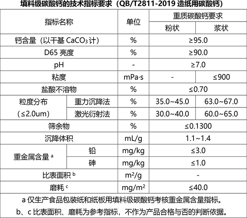 2020年4月1日,QB/T2811-2019造紙用碳酸鈣代替QB/T2811-2006造紙研磨碳酸鈣正式實施。依據標準,造紙用碳酸鈣按產品用途分為填料級碳酸鈣、涂布級碳酸鈣。其中填料級碳酸鈣包括重質碳酸鈣(研磨碳酸鈣)和輕質碳酸鈣(沉淀碳酸鈣),涂布級碳酸鈣包括底涂碳酸鈣和面涂碳酸鈣。