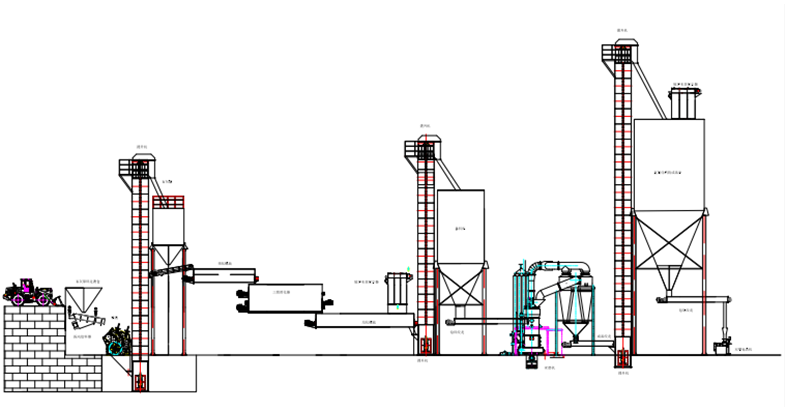 振動(dòng)給料--》錘式破碎機(jī)破碎(脈沖除塵器)--》提升機(jī)--》原料罐--》給料皮帶--》預(yù)消化系統(tǒng)--》消化系統(tǒng)--》均化系統(tǒng)--》提升機(jī)--》圓筒篩(排渣)--...